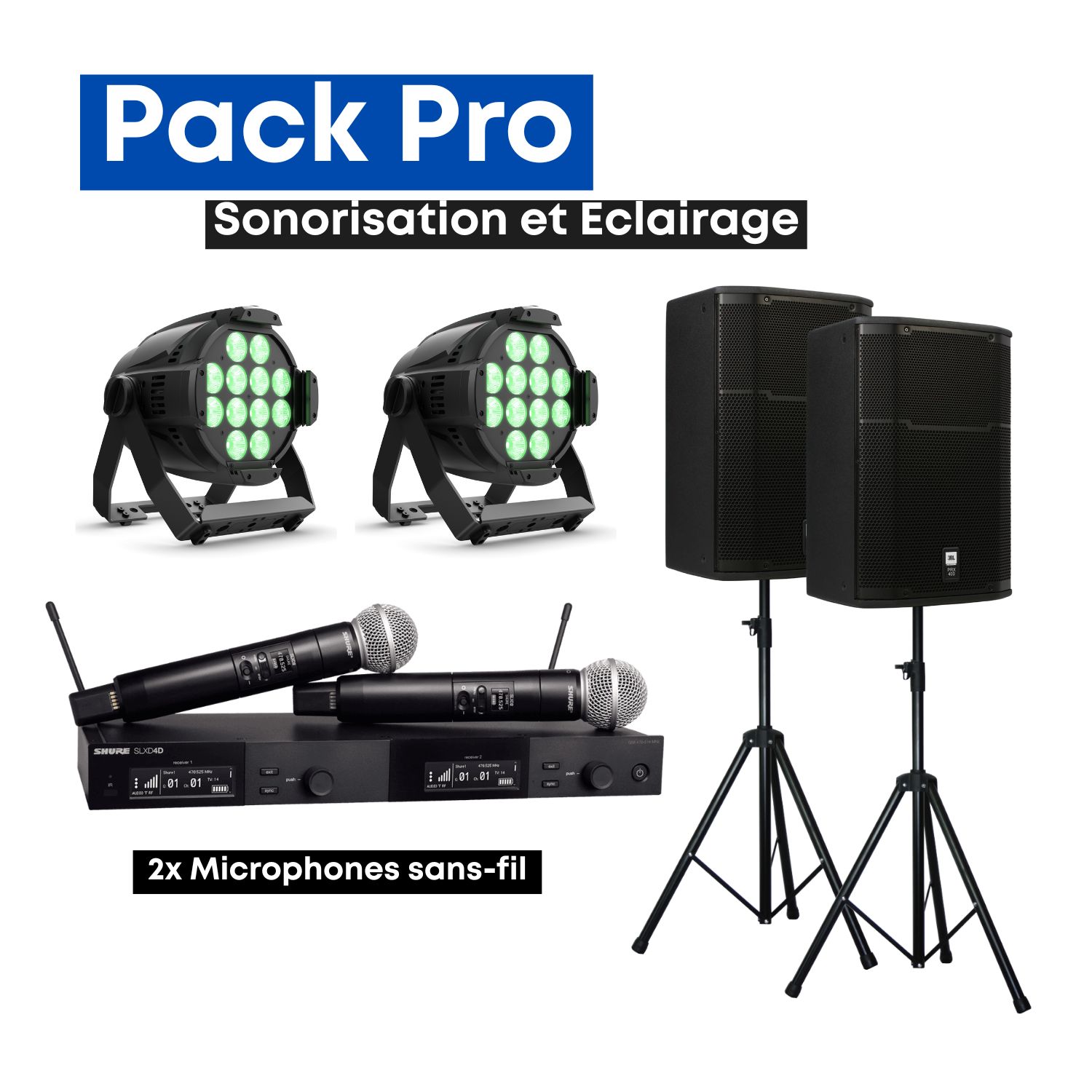 Pack complet avec 2 enceintes, 2 microphones sans-fil, 2 projecteurs LED (pour éclairage de face ou ambiance lumineuse coloré).